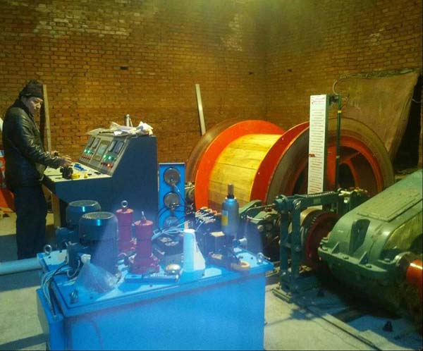 2、電機(jī)上下定子及轉(zhuǎn)子吊裝,用20T的吊車移到提升孔的位置;在吊裝到南門時(shí),在主井井塔的提升孔的位置,把起重機(jī)鉤頭和吊車同時(shí)掛上吊點(diǎn),一拉一松同步進(jìn)行,使其停放在提升孔的位置;然后用起重機(jī)起吊,注意繩頭和包裝箱接觸的地方要用木板墊好,防止受力時(shí)損壞包裝箱進(jìn)而損壞設(shè)備。JTPB-1.6×1.2防爆提升絞車導(dǎo)向輪的吊裝,等吊到第十三層時(shí)用5T千不拉配合起重機(jī)把導(dǎo)向輪牽引到六層井塔內(nèi),再用扒桿移動(dòng)到合適位置即可。